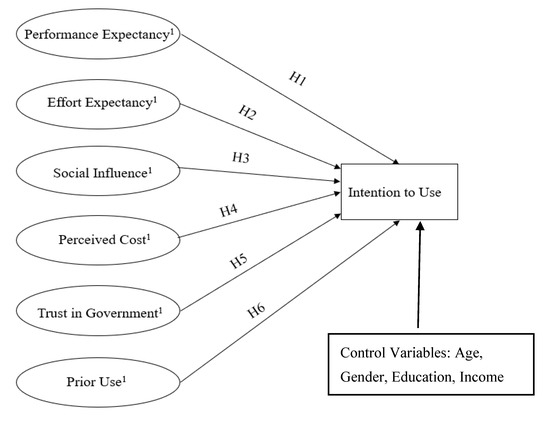 The concept of perceived usefulness or performance expectancy (PE) refers to the degree to which prospective users expect that using a specific technology will provide personal benefits [25]; the greater the expectations, the more likely individuals will adopt the technology. PE incorporates five constructs from different technology adoption models, including the perceived usefulness of the technology, extrinsic motivation to use it, job-fit, relative advantage compared to older technologies, and outcome expectation (beliefs about positive or negative consequences of using the technology), and is found to be the most salient factor predicting technology adoption intention [24]. The variable of performance expectancy in the current study captures the traditional perceived benefits of using mobile apps, such that it includes citizens’ perceptions of speed, mobility, reachability, and convenience associated with use of the app [34,35,36].