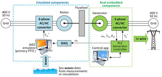 The block with real components includes a generator, a power converter and a Programmable Logic Controller (PLC) that run the system control law. This section is the apparatus that connects a real WEC installed in the sea with the grid, but it can be replaced by other kind of control units based on microcontrollers and FPGAs. In the real system, the motor shaft is joined to that of the generator by a gearbox or a joint, and the system inertia can be increased up to 8 kg⋅m2 by adding a flywheel.