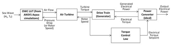 26]. Its W2W model considers a multi-chamber OWC, where the interaction between the structure and the waves produces a pneumatic power. Here, the pneumatic power was obtained by simulations of a numerical model (3D physical simulations with ANSYS Aqwa of the hydrodynamics supplying wave forcing and a time domain model for the air flow, as a function of the turbine head loss) validated with wave flume experiments on a scaled prototype working at different sea states. As best practice suggests, the design of the power electronics control was considered from the early stages of the project.
