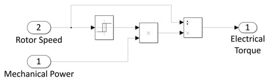 Generally, the control block reads variables of the generator (e.g., rotor speed and torque) and the power electronics (e.g., output voltage and frequency) and responds with command signals to set the controlled variables to the desired values. In this case study, it will be shown how to control the rotor speed of the generator measuring the same speed and the shaft torque (evaluating with different laws the electric torque).