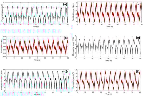Simulated (black traces) and measured (red traces) variables: (a) pneumatic power; (b) rotor speed; (c) mechanical torque; (d) electrical torque; (e) mechanical power; (f) electrical power. Sea state: Hs = 1.6 m, Ts = 5.1 s. Turbine: Impulse. Control law: MPPT.
