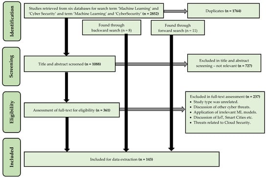 Threats to validity: For this review, we included the studies that (1) deal with anyone of the six machine learning models in cyber security, (2) target cyber threats including intrusion detection, spam detection, and malware detection, and (3) discuss the performance evaluation in terms of accuracy, recall, or precision. We have used multiple combinations of strings such as ‘machine learning and cyber security’ and ‘machine learning and cybersecurity’ to retrieve the peer-reviewed articles of journal, conference proceedings, book chapters, and reports. We have targeted the six databases, namely Scopus, ACM Digital Library, IEEE Xplore, ScienceDirect, SpringerLink, and Web of Science. Google Scholar was also used for forward and backward search. We have focused on recent advancement in the last ten years. In total, 2852 documents were retrieved, and 1764 duplicated items were removed. The title and abstract were screened to identify potential articles. The full text of 361 studies were assessed to find the relevancy with the inclusion criteria. We have excluded the articles that were discussing (1) the cyber threats other than intrusion detection, spam detection, and malware detection, (2) threats to cyber-physical systems, (3) threats to cloud security, IoT devices, smart grids, smart cities, and satellite and wireless communication. With backward and forward search, 19 more studies were retrieved. In total, 143 studies were finally selected for data extraction purpose.