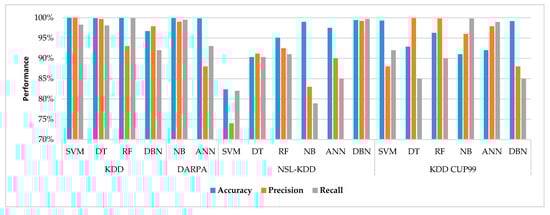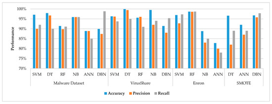 Figure 5 shows the comparative analysis of accuracy, precision and recall values for the detection of intrusion, spam and malware. We have taken the maximum value obtained by six machine learning models regardless of the dataset. It is depicted that SVM, DT and RF have given the maximum accuracy and precision value for intrusion detection. However, DBN and ANN reported the best recall value for the detection of intrusion. It is recommended that SVM, DT, NB, and RF should be considered for intrusion detection if accuracy is the priority for intrusion detection. DBN and ANN comparatively performed worse than other models to detect malware. However, ANN has shown exceptional recall value for the detection of malware. RF and NB have shown better accuracy for the classification of spams yet DBN again recommended in case precision and recall is the priority of situation. Keeping in view the metrics collected from reviewed papers, RF and NB are recommended for the classification of spam, and SVM and DT for the detection of malware, respectively, for better accuracy.