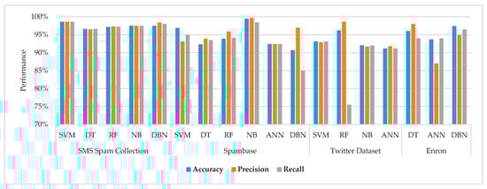 Figure 4 shows performance evaluation of machine learning techniques based on frequently used datasets for spam classification. Spambase is a famous spam dataset, and NB performed better among other machine learning models with respect to the accuracy, precision, and recall. Researchers have also collected dataset from Twitter, containing millions of tweets. RF has outperformed and reported more than 97% precision value. All evaluated machine learning models have shown more than 90% accuracy to detect and classify spam. SVM and DBN have shown better accuracy, recall and precision among other models when applied to the collection of SMS to classify spam text messages. It can also be observed that SMS collection is a customized dataset collected by the researcher. Every machine learning model has given more than 95% accuracy, precision, and recall, whereas the same machine learning models have different performance values on standard datasets, i.e., Enron and Spambase.