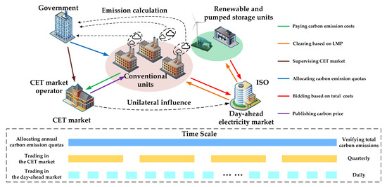 To date, numerous valuable studies have analyzed the impact of CET mechanisms on the electricity market. Wang et al. proposed a two-stage scheduling model to comprehensively investigate the environmental benefits of consumers participating in both electricity and CET markets [9]. Zhou et al. aimed to analyze these potential profit impacts and the possible compensation to affected generation companies through modeling the Australian National Electricity Market under a potential emission trading scheme [10]. In [11], a model was proposed to determine equilibrium fuel, power, and emission trades in an electric power supply chain framework with a load-based emission trading program. In [12], a novel model was proposed to optimize the decision-making process in the interrelated electricity, fuel, and carbon markets in order to maximize the GENCO’s profit. In [13,14], the short-term unit combination problem with carbon emission constraints was investigated, and a solution was developed in which the carbon emission costs will be added to the system operation costs when the total carbon emissions of a system exceed its allocated quota. Based on the classic Cournot equilibrium model, Li et al. modeled different types of units separately and established a bi-level programming model to study the impact of carbon emission costs on the equilibrium state of the market and the strategic behavior of market members [15]. Each market member can achieve the maximum benefit in this case. However, the marginal price of the electricity market can be obtained only when the independent system operator (ISO) figures out the inverse demand function of the market in advance, which is inconvenient in practice. To analyze the impact of different carbon emission quota allocation schemes on the unit combination results, system operation costs, and changes in the benefits structure, Wang et al. established a security-constrained unit combination model considering the allocation of carbon emission quotas [16]. However, it ignored the conflicts of interest between different entities of the market and failed to make a scheduling result that could take into account the different entities. Therefore, the model could not truly reflect the impact of carbon emission quotas on the marginal price of the electricity market.