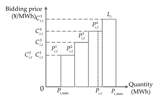 In this paper, we assume that the generating units bid and offer in the day-ahead electricity market, while the consumers only declare quantity in the demand side. Without CET, the quotation curve of a conventional unit is segmented, as shown in Figure 2, where Pi,min and Pi,max represent the lower and upper output limits of unit i, respectively. The quotation of unit i in the kth step at time t can be written as: