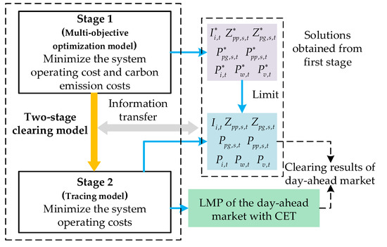 To analyze the effect of carbon emission quota allocation on the LMP of the day-ahead electricity market, a two-stage model within the CET mechanism is proposed in this paper. The relationship between the two stages of the model is shown in Figure 3.