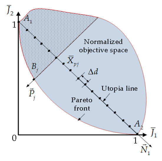 Step 6: Draw the normal of the Utopia line across , and generate a corresponding Pareto point Bj by intersecting this normal with the Pareto front. In order to find the optimal point Bj in the Pareto front, minimize , which is subject to Equations (32) and (33). This optimization process should be forced to stay within the feasible region of the normalized objective space, i.e., the region labeled with the dot in Figure 4. Mathematically, the single objective optimization problem can be expressed as follows: