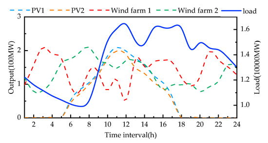 This study proceeds with calculations using the operation data of a real 1560-bus system in China to verify the performance of the proposed methodology. This system consists of 729 branches, 1028 transformer branches, and 52 generators, including four nuclear power plants with total capacities of 4152 MW, whose daily outputs are constant; two pumped storage units with a capacity of 350 MW; two wind farms with capacities of 360 MW and 280 MW, respectively; two PV units with capacities of 250 MW and 220 MW, respectively; four refuse incineration power plants; six coal-fired units; twenty-eight gas-fired units; and four combined heat and power units (all gas-fired). The total installed capacity of the system is 11,543 MW. This system has peak and valley loads of 17,434 MW and 9370 MW, respectively. Figure 5 presents the forecast total daily load, the outputs of two wind farms, and the outputs of two PV units. For this system, Lu% and Ld% are set to 3% and 1%, respectively; η is set to 95%; and the emission coefficients of coal-fired and gas-fired units are set to 0.85 t/MWh and 0.35 t/MWh [22], respectively.