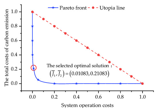 According to Table 1, the value of j varies from 0 to 10, indicating that the weights of the objectives and change accordingly. After obtaining the optimal solution set, we need to select the compromise solution to fix the on/off statuses and outputs of generating units. Various techniques to select the compromise solution were proposed in [23,24]. In this paper, we expect to find a compromised optimal solution that minimizes the sacrifice to J1 while greatly reducing the value of J2. Therefore, we can find that the most suitable solution is at j = 4, according to the comparison between the nodes of the Pareto front and their values corresponding to objectives and in Table 1 and Figure 4. With this solution, the values of and are 0.01083 and 0.21083, respectively, indicating that the system operation costs are very close to the minimum, and the total carbon emission costs paid by conventional units are small. Hence, we choose the point as the compromise solution.