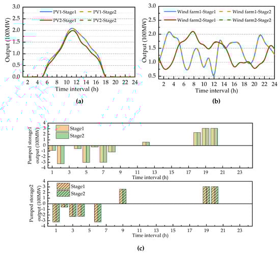 Comparison of outputs of renewable energy units and pumped storage units. (a) Comparison of outputs of PV units; (b) Comparison of outputs of wind farms; (c) Comparison of outputs of pumped storage units.