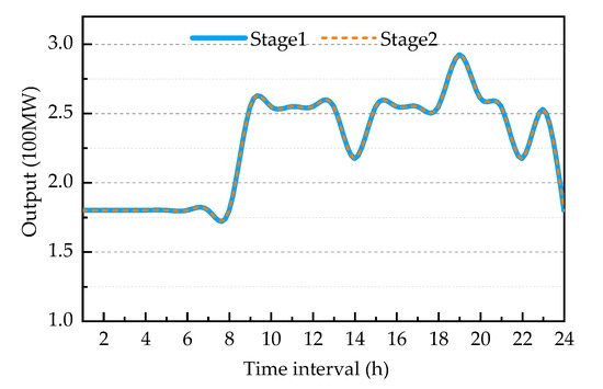 In the simulation, we use the two-stage model to solve the LMP of the day-ahead electricity market considering the impact of carbon emission quotas. In order to ensure the accuracy of the LMP calculated by the two-stage model, we compare the solutions obtained from the first stage of the model and the second stage of the model. Figure 7 shows the comparison of outputs of renewable energy units and pumped storage units. Figure 8 illustrates the comparison of outputs of the coal-fired unit with a capacity of 350 MW.