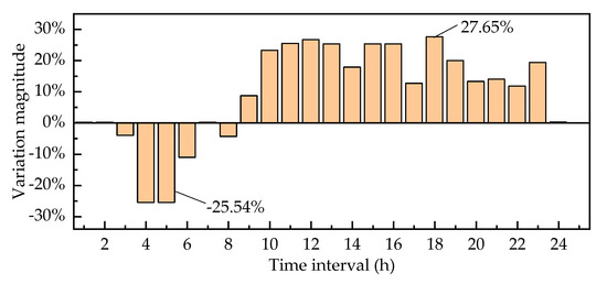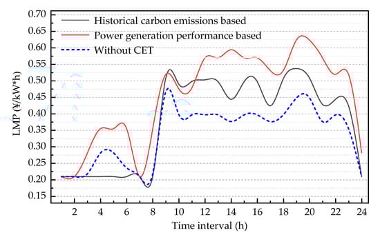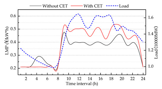 According to Figure 9 and Figure 10, the LMP has changed after considering the impacts of the CET mechanism. The LMP in the CET mechanism during the peak load period is higher than that without the impact of carbon emission quota allocation, with a maximum increase of 27.65%, while it drops during the valley load period with a maximum decrease of 25.54%. Both daily LMP variation trends are the same as the load curve.