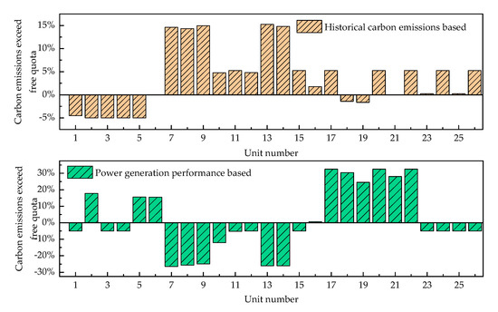 Figure 11 illustrates the comparison of carbon emissions of conventional units between two different carbon emission quota allocation methods. The on/off statuses of conventional units are the same under two different allocation methods. As shown in Figure 9, units 1–6 are coal-fired units, and units 7–26 are gas-fired units. When the quota is allocated based on the historical carbon emissions, all of the carbon emissions of the coal-fired units do not exceed their free quotas, and only three of the twenty gas-fired units are below the allocated quotas. In the case of using the power generation performance-based method to allocate quotas, the carbon emissions of some coal-fired units do exceed their reduced quotas due to their lower power generation performance. On the contrary, only six of the twenty gas-fired units have exceeded their quotas because of their increased quotas and their low carbon emission coefficients. The possibility that the carbon emissions of gas-fired units will exceed their quotas has been greatly reduced.
