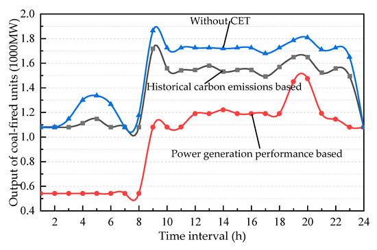 Figure 12 displays the comparison of outputs of coal-fired units between two different carbon emission quota allocation methods. Due to the high carbon emission coefficient, the output of coal-fired units will be cut down to reduce their total carbon emission costs in the CET mechanism. The reduction of output is more obvious during the valley load periods. The output of coal-fired units will be further reduced (up to 59.62%) if their quotas are allocated based on their power generation performance.