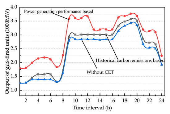 Figure 13 shows the comparison of outputs of gas-fired units between two different carbon emission quota allocation methods. Although the marginal costs of gas-fired units are higher than those of coal-fired units, the carbon emission costs are lower due to their lower carbon emission coefficients. In order to meet the power balance constraints, the outputs of the gas-fired units will increase in the CET mechanism. The increase of gas-fired units’ outputs can reach a maximum of 58.4% when the emission quotas are allocated based on power generation performance.