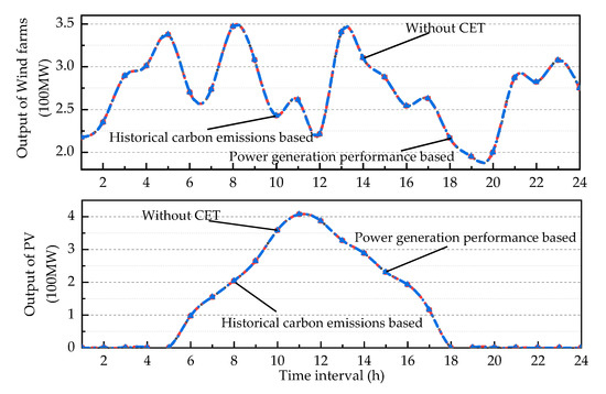 Figure 14 demonstrates the comparison of outputs of renewable energy units between two different carbon emission quota allocation methods. Renewable units do not emit carbon during power generation. Due to the sufficient peak shaving capacity of the proposed system, the outputs of renewable units are not affected by the CET.