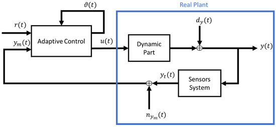 In Figure 1, the high level architecture is reported, where we take into account the adaptive control, which takes, as input signals, the measured output vector from the physical process , the reference output vector and the actual value of the internal parameters vector , and . By real plant, we mean the union of the dynamic part, which is the part of the system usually modelled through a differential equations system, the dynamic of the sensors system including the effect of external disturbance vector and measured noise .