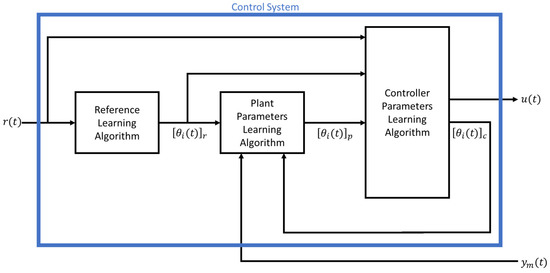 Our control system architecture is composed of three different subsystems, each one with a different functionality. As we explain better through mathematical formulation, a level for the reference signals approximation is required for our solution, as well as a level for the assessment of the plant model, and a final level for the control parameters adaptation. Schematically, the starting point is represented in Figure 1, where a simple control loop is reported, valid also for MIMO and the general non-linear system.