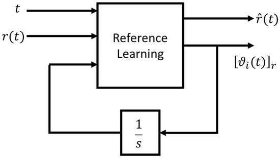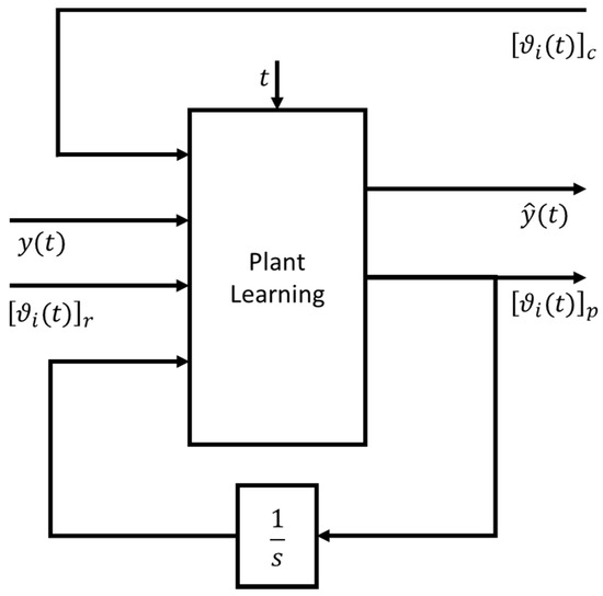 In this functional block the learning of the control state space representation parameters is done, in which the learnt coefficients in other subsystems are considered as constant values. In this part of the control algorithm the coefficients of the matrix and are considered as known; meanwhile, the coefficients of the matrix and are updated with the following rules. In this way, . This approach is different from the previous functional block in Section 3.2, where, instead, the reference was to variables with subscript label “p” plant, instead of “c” controller.