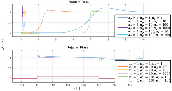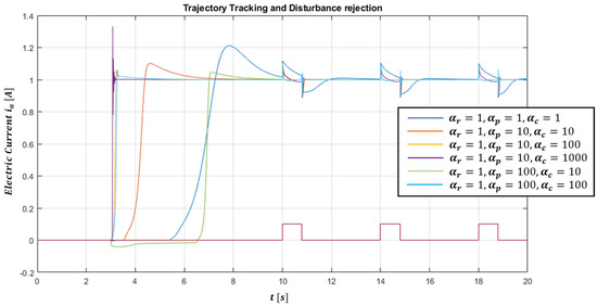 Figure 8 shows the response to the current step of the closed loop system, which is simultaneously required to reject a 10% amplitude disturbance with respect to the reference signal. Figure 9 shows a particular view of the transitory phase and of the rejection phase of Figure 8. The step responses in Figure 8 are superimposed as the learning parameter combinations change; in particular, it can be noted that a valid combination is that given by .
