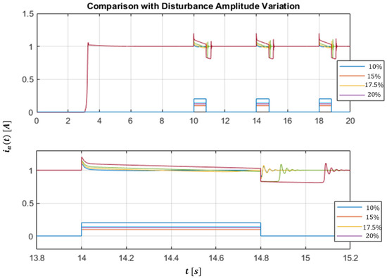 Figure 10 shows the result obtained by varying the amplitude of the disturbance, with a progressively higher percentage. In the legend, the percentages of the disturbance amplitude are relative to the amplitude of the current reference. Clearly, as the amplitude of the disturbance increases, the performance of the closed loop system also deteriorates. However, the rejection of the disturbance is still satisfactory, with a relative amplitude of 20%.