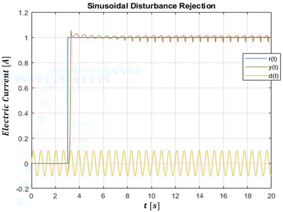 For completeness in the validity analysis of the proposed control algorithm, the result of current stepped trajectory tracking in which it is required to reject a sinusoidal shaped disturbance is also reported. This further explains that the result obtained is not a function of the chosen waveforms, considering that the step function is the worst in terms of discontinuity of the derivative among all the reference signal choices. Figure 11 shows the rejection result of a sinusoidal current disturbance, with a relative amplitude of 10%, relative to the step reference.