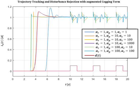 Below is also the verification made on the tracking of the trajectory in terms of the desired armature current, under conditions of uncertainty about the value of the cogging torque. We report the trajectory tracking graph in which the rejection of a piecewise current disturbance is required, with a 15% increase in the maximum intensity of the cogging torque model used in the BLDC dynamic model.