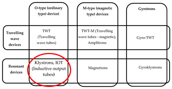 O-type resonant devices can be divided into two classes: devices with velocity modulation (klystron type) and devices with emission modulation (IOT type). The first class includes various modifications of klystrons, while devices of the second class have several names: klystrodes, inductive output tubes (IOTs), tristrodes, among others.