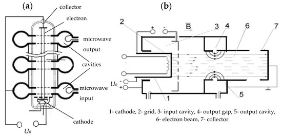 - Dokolin, O.A.; Kuchugurny, S.V.; Lebedinsky, S.V.; Malichin, A.V.; Petrov, D.M. Klystron with an electronic efficiency of 90%. Izv. Vuzov USSR Radio Electron. Kiev. 1984, 27, 47–55. (In Russian) [Google Scholar]
