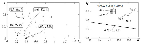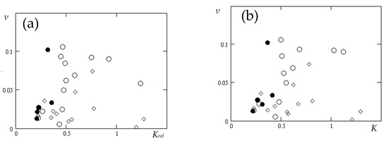 Produced klystrons: (a) in the coordinates (Krel-ν,), (b) in the coordinates (K-ν), divided into three groups by efficiency level: ◊ η < 40%, ○ η = 40–60%, ● η > 60%.