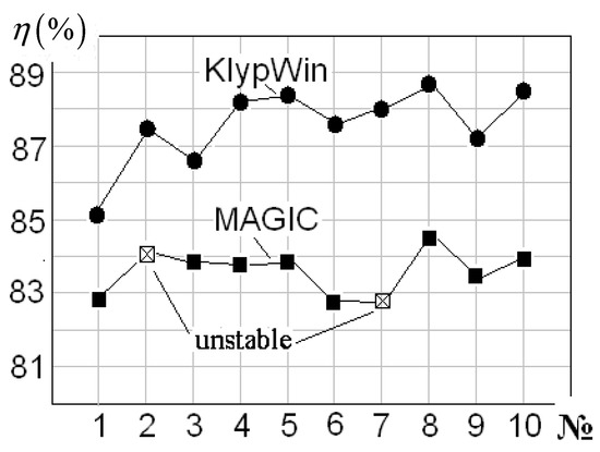 Let’s look at the features of such codes on the example of the TESLA (USA) code, created by a group of specialists from several scientific organizations in the United States. As follows from the description in [29], for example, the TESLA code uses the separation of the microwave fields of cavities and fields (coulomb and microwave) in the region of beam motion. The crosslinking of these fields in the gap area occurs on the continuation of the inner surface of the drift pipe. This separation corresponds to the specifics of the klystron and allows us to separate the problems of electrodynamics (modeling of microwave fields in the cavity) and electronics (beam bunching, interaction of the beam with microwave fields). This, in turn, leads to the possibility of using different scales of computational grids in the cavity region and in the interaction region, while accordingly leading to the possibility of a significant reduction in the number of particles and a consequent reduction in calculation time. The calculation time for one option under the TESLA code is 10–20 min on a personal computer. This is too much to optimize on a PC, but on multiprocessor supercomputers, optimization can be performed using this code. It should be noted, however, that due to the simplifying assumptions used in the construction of the model, the question of the methodological error of the results remains open. For example, in the results given in [29], the discrepancy between the results of TESLA and MAGIC seems significant.