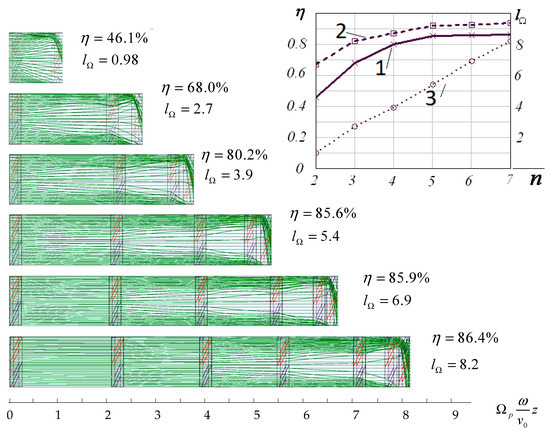 The general scaling principle (GSP; transcription as “global scaling principle” was also used in publications [25]) is the statement that two klystrons with the same values of dimensionless Parameters (2)–(9) are physically equivalent. All processes of the grouping and selection of energy occur in these two devices in the same way. These two devices will have the same dimensionless output characteristics, including the same efficiency. At the same time, such klystrons can differ greatly in the level of output power, the number of beams, the accelerating voltage, the operating frequency and other basic dimensional characteristics.