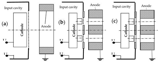 Thus, for a resotrode with 2π-regeneration, it is necessary to use the scheme of Figure 11b. However, in contrast to the classic MB IOTs, the grid can be much more large-scaled and, for flat cathodes, a set of monocrystalline graphite “whiskers” laid in parallel in a row on the control electrode can be used as such a grid. This design of the grid (common to all beams) will significantly simplify the technology and avoid misaligned deformations due to thermal care.