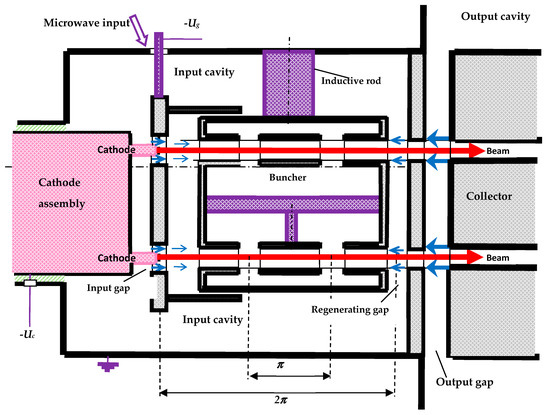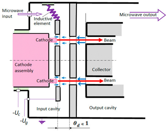 - Baikov, A.Y.; Grushina, O.A.; Strikhanov, M.N. Maximal efficiency versus the amplification factor in double-cavity klystrons. Tech. Phys. 2013, 58, 594–600. [Google Scholar] [CrossRef]