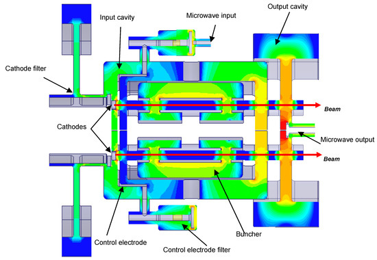 - Baikov, A.Y.; Baikova, O.A. Simulation of Super Power Two-Frequency Klystrons of L-band with Efficiency of 90%; Bulletin of the National Research Nuclear University MEPhI: Moscow, Russia, 2017; Volume 6, pp. 83–89. (In Russian) [Google Scholar]