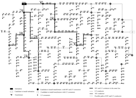 - Paiva, P.C.; Khodr, H.M.; Dominguez-Navarro, J.A.; Yusta, J.M.; Urdaneta, A.J. Integral planning of primary-secondary distribution systems using mixed integer linear programming. IEEE Trans. Power Syst. 2005, 20, 1134–1143. [Google Scholar] [CrossRef]
