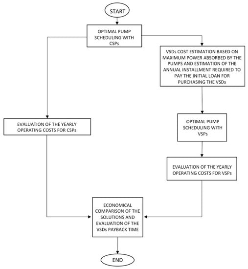 In this work, the optimal regulation of pumping systems in WDNs is performed with both CSPs and VSPs. The results obtained are compared from an economic point of view to establish whether the additional costs to purchase VSDs is justified. The procedure employed within this manuscript is reported in Figure 1.