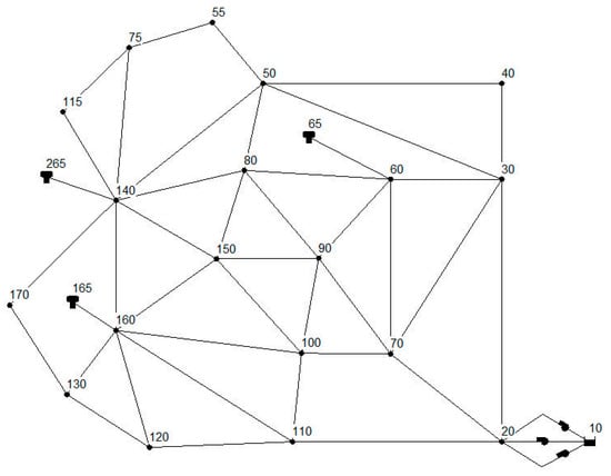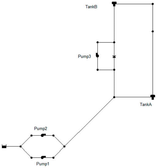 The network was proposed in [23] and it is comprised of 41 pipes, 19 nodes, three storage tanks, a supply source, and three identical pumps in parallel. A schematic of the network is reported in Figure 3.