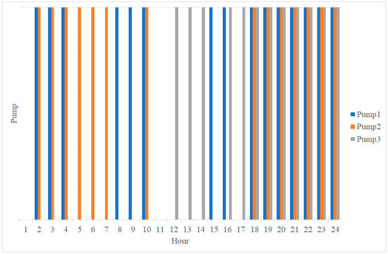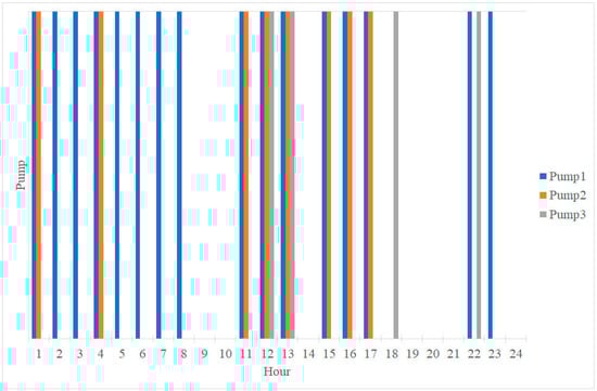 This network is fed by two pumps (Pump 1 and Pump 2), plus one pump acting as a booster (Pump 3), one reservoir, two tanks, 15 pipes and 13 nodes, two of which are demand nodes. The users demand that the two demand nodes follow a daily pattern that is reported in the paper by [21] with all the data concerning the network characteristics (pipe diameter, node elevation, pump characteristic curves, etc.). Interested readers may refer to the cited paper to retrieve all network data, which are not reported herein for the sake of brevity. For Case 1, pump efficiency curves were provided only for Pump 1 and Pump 2, and then VSD were considered only for these two pumps, while Pump 3 works at constant speed. Despite the fact that Case 1 was considered in several papers from the literature [6,21,22], the authors performed an optimization to determine the best solution with ON/OFF regulation, obtaining the best result so far (see Table 1) for this network. The pumps’ ON/OFF patterns are reported in Figure 3 (the histogram when each pump is active).