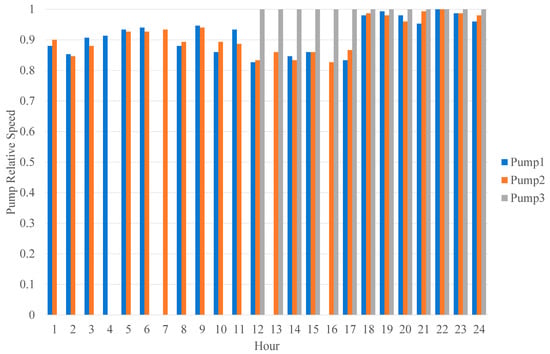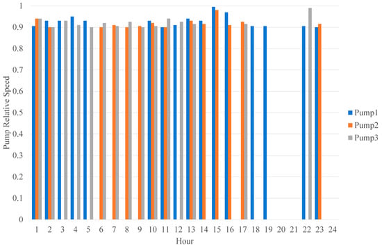 In contrast to the previous case, the pumps were switched on more frequently: Pump 1 and 2 were switched on three times and Pump 3 was switched on twice (the maximum number of switches in this case is three per day; see [19]) and, as can be seen from Figure 7, most of the time, the pumps are working close to the minimum relative speed.