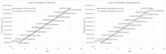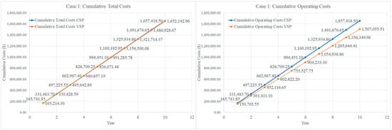 Figure 9. Case 2: Cumulative total (left) and operating (right) costs with both CSPs and VSPs.