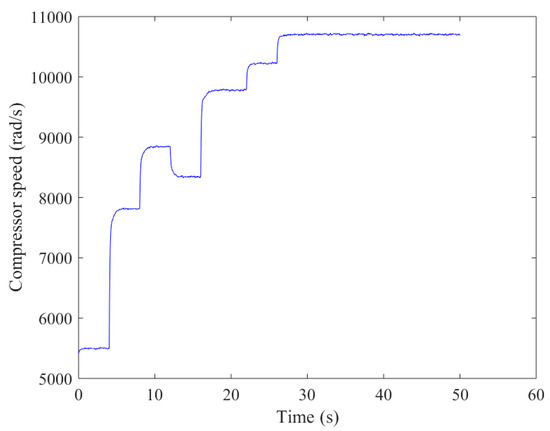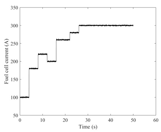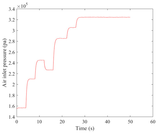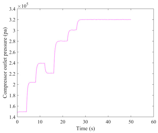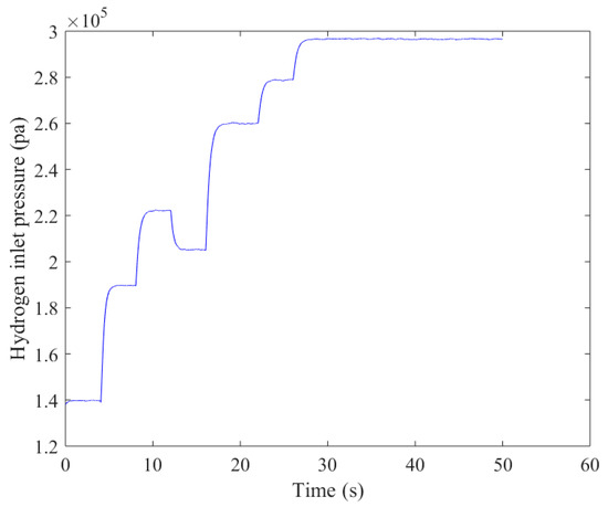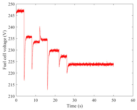 The Fault 0–4 states are simulated using the PEM fuel cell simulator model in the dynamic condition. Eight diagnostic variables are selected from the PEM fuel cell simulator model, and the eight diagnostic variables are fuel cell current(), fuel cell voltage(), compressor speed(), compressor outlet pressure(), compressor motor voltage(), compressor motor current(), hydrogen inlet pressure(), and air inlet pressure(). Taking the Fault4 state as an example, Gaussian noise with variance of 1.0 is added to the PEM fuel cell simulator model. The fuel cell current, fuel cell voltage, compressor speed, compressor outlet pressure, compressor motor voltage, compressor motor current, hydrogen inlet pressure, and air inlet pressure change with time, respectively, are shown in Figure 3, Figure 4, Figure 5, Figure 6, Figure 7, Figure 8, Figure 9 and Figure 10.