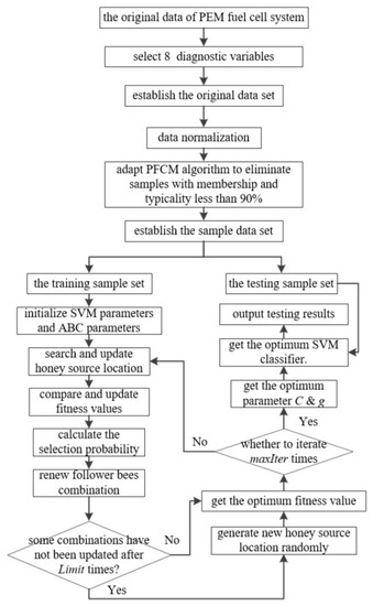 Fault diagnosis flow chart of the fuel cell system based on the PFCM-ABC-SVM method.