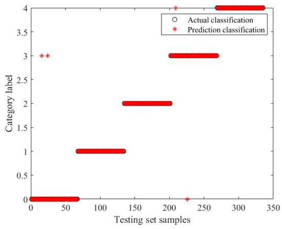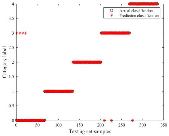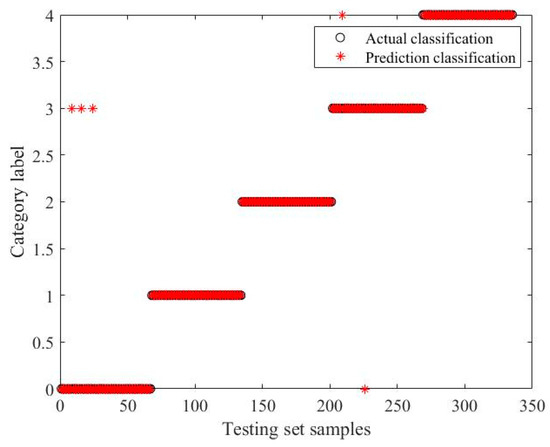 When the Gaussian noise variance is 1.0, the PFCM-ABC-SVM method is compared with the GA-SVM, PSO-SVM and ABC-SVM methods. The comparison between the PFCM-ABC-SVM method and the other methods is shown in Table 3. The classification results of the PEMFC-ABC-SVM method when the Gaussian noise variance is 1.0 are shown in Figure 12. For the Fault 0–4 states, the accuracy of the training set sample is 95.67%, and the accuracy of the testing set sample is 92.84% using the PSO-SVM method; the accuracy of the training set sample is 95.82%, and the accuracy of the testing set sample is 94.03% using the ABC-SVM method; the accuracy of the training set sample is 97.46%, and the accuracy of the testing set sample is 97.31% using the PFCM-ABC-SVM method. Therefore, the PFCM-ABC-SVM method can effectively improve the accuracy of fault diagnosis of the PEM fuel cell system. The category label in Figure 12, “0” represents Fault0, “1” represents Fault1, “2” represents Fault2, “3” represents Fault3, and “4” represents Fault4. There are 335 samples in the testing set samples.