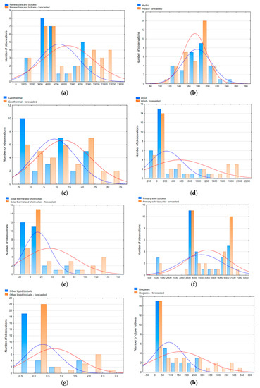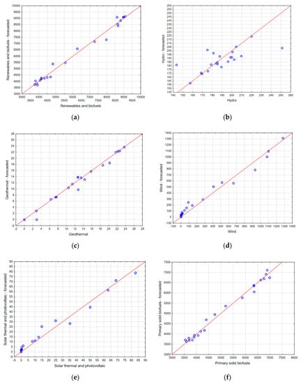 For the obtained forecasts of the total renewable energy production, and based on the sources included in the analysis, the mean error, mean percentage error, mean absolute error and the mean absolute percentage error were determined. These errors were determined from the following relationships [70,71]: