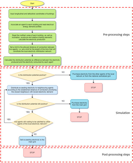 The steps of the agent-based model have been briefly summarized in the flowchart of Figure 1. The electricity distribution within the local microgrid follows three main steps: a pre-processing stage characterized by the import of all input parameters into NetLogo, a simulation stage in which distribution takes place according to a set of predefined rules and, finally, a post-simulation stage collecting data on the exchanged electricity flows (in terms of both local microgrid and main grid).