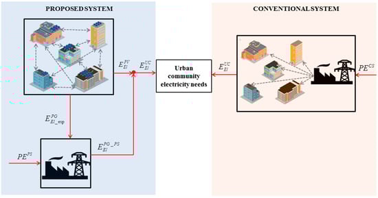 The local microgrid constituted by PV plants installed in an urban community (UC) is here considered as a proposed system (PS). The energy, environmental and economic performances of PS are compared with those of a conventional system (CS) in which the electricity needs of urban area are satisfied by taking off electricity from a main power grid (PG). Both PS and CS are schematically represented in Figure 2.