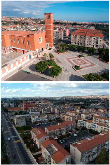 This paper describes the results of the application of the described agent-based model to an urban community (UC) located in Southern Italy. The area counts 370 buildings, the majority of them belonging to social houses (i.e., building stocks owned by the local government and rent to people with low incomes), but also including independent houses owned and occupied by a single-family unit, supermarkets, retail shops and a church. The electricity demands of the area have been collected merging data derived from both audits and public databases of the National Statistical Institute [32] and by Terna S.p.A. [33] for residential buildings. For non-residential buildings, data have been averaged from Confcommercio [34] and the Italian National Agency for New Technologies, Energy and Sustainable Economic Development (ENEA) [35]. Geometrical features of the rooftops derive from a data collection campaign: available data refer to the typology of roof (span or flat), to the orientation and shading from surrounding buildings. Two panoramic views of the area are reported in Figure 3.