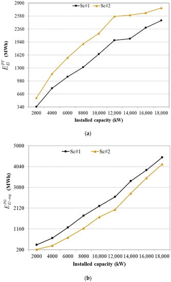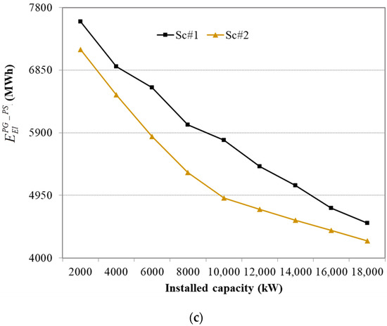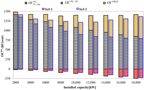 In order to better analyse the operating costs of PS, each term expressed in Equation (11) is displayed in Figure 8 for Sc#1 and Sc#2 and for all PV powers, while operating costs of conventional system (OCCS) are constant and they are equal to 1494 k€/year. The most of operating costs of proposed system (OCPS) is constituted by operating costs due to the electricity imported from main power grid (OCPG_PS) for all PV installed powers, but its contribution decreases with PV power increase. On contrary, the operating cost due to electricity exported to main power grid () and the operating and maintenance costs (OCO&M) show an opposite trend rising with PV installed capacity. More in detail, OCPS in Sc#1 is higher than Sc#2 because two contemporary events occur: